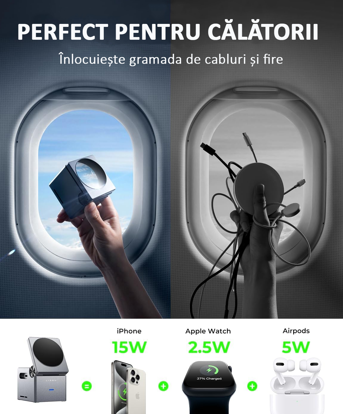 • Design compact si portabil: Fie ca esti acasa, la birou, in calatorii sau intr-o sedinta, acest incarcator practic mentine spatiul organizat si fara cabluri incurcate.