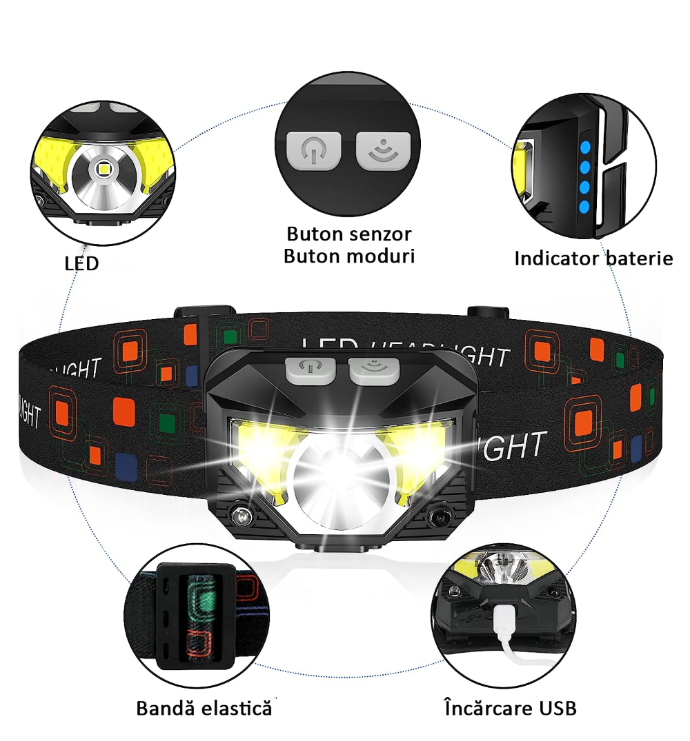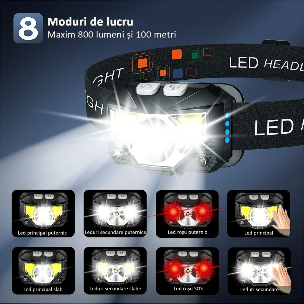 - Cu un acumulator integrat de 800 mAh, aceasta lanterna frontala iti ofera intre 5 si 10 ore de autonomie, asigurandu-ti iluminare constanta pe durata activitatilor tale. Indiferent daca esti intr-o aventura nocturna in aer liber, intr-o excursie montana sau in cautarea obiectelor intr-o zona slab luminata, lanterna frontala de cap cu LED este partenerul perfect.