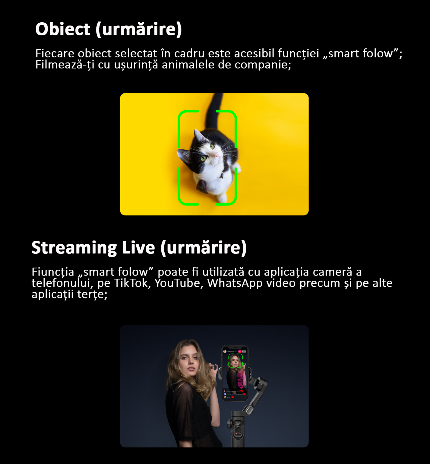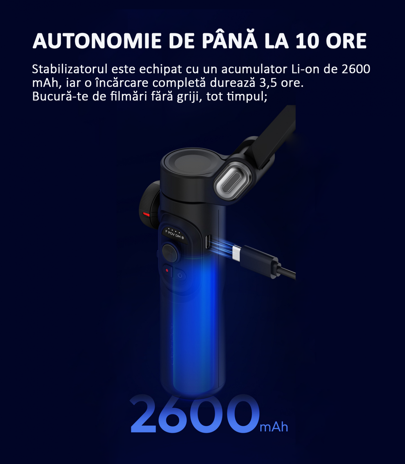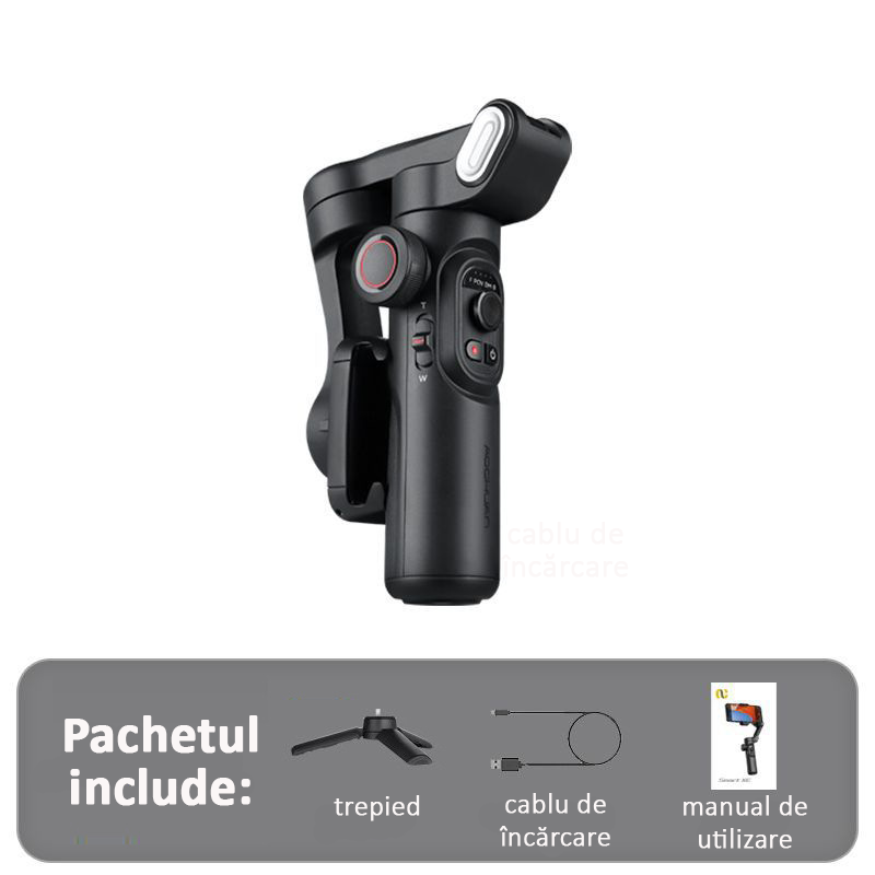 Stabilizator smartphone cu 3 axe, control cu joystick, autonomie de 10 ore, pliabil, aplicație dedicată, tripod inclus.