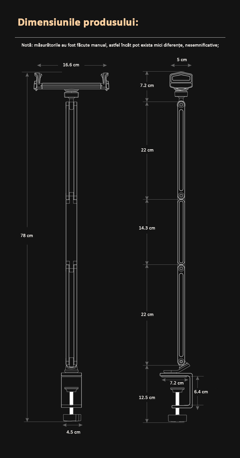 · Capacitate si Materiale: Capacitatea maxima de suportare este de 1 kg, datorita constructiei robuste din aluminiu prelucrat prin CNC. Cele 3 brate ale suportului confera o stabilitate exceptionala, asigurand in acelasi timp flexibilitatea necesara pentru diverse pozitionari.